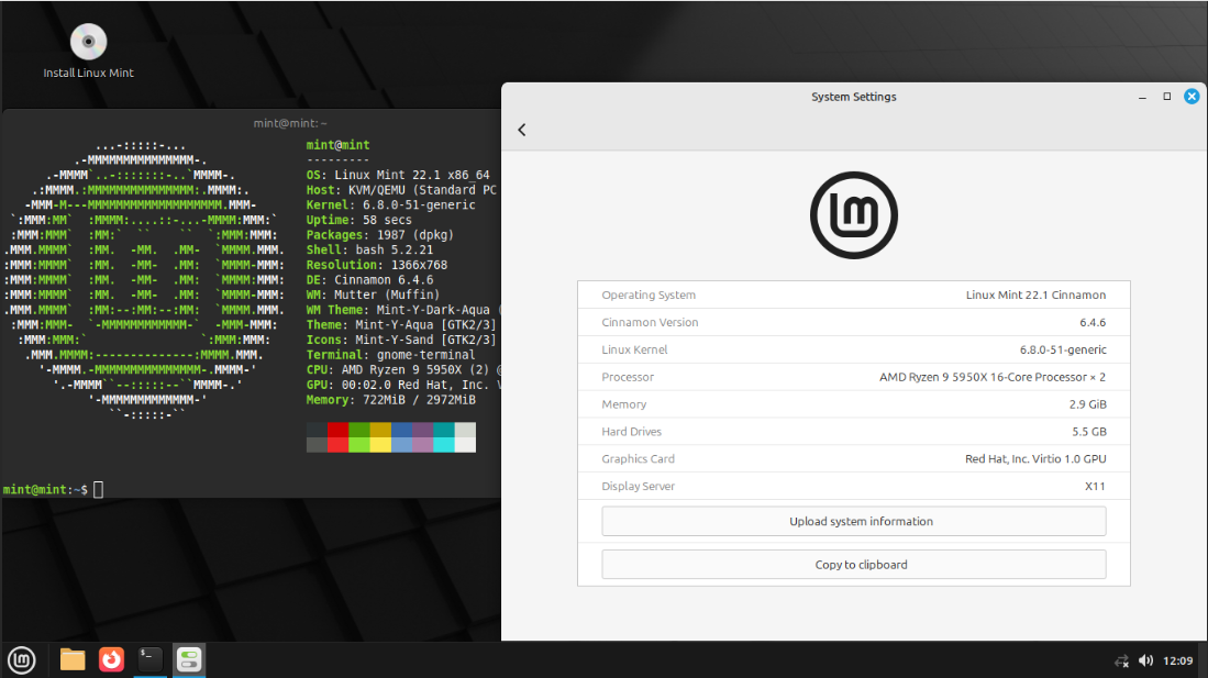 インストール後に情報を表示させてみると「Linux Mint 22.1」となっていることがわかります。